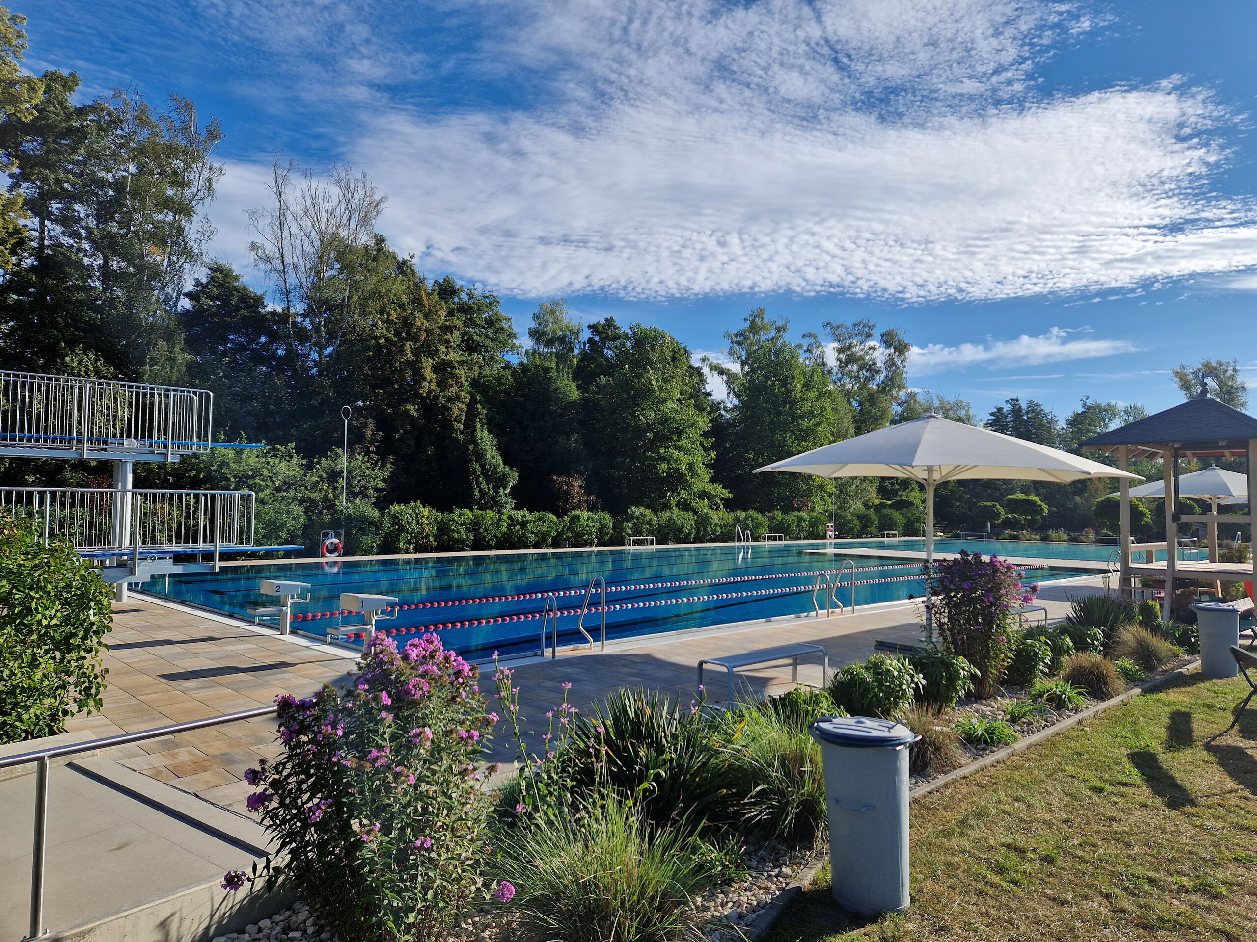 - Sprunganlage: Für Mutige stehen zwei Sprungtürme (1 m und 3 m) zur Verfügung, um das kühle Nass mit Schwung zu erobern.